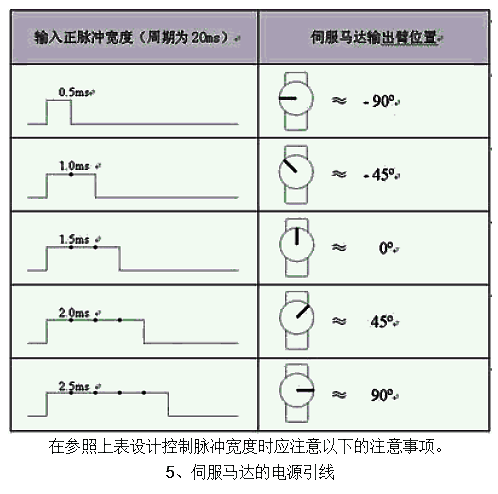 隔離(因為伺服馬達會產生噪音)。甚至小伺服馬達在重負載時也會拉低放大器的電壓,所以整 個系統的電源供應的比例必須合理。 輸入一個周期性的正向脈沖信號,這個周期性脈沖信號的高電平時間通常在1ms—2ms之間,而低電平時間應在5ms到20ms之間,并不很嚴格,下表表示出一個典型的20ms周期性脈沖 的正脈沖寬度與微型伺服馬達的輸出臂位置的關系: 在參照上表設計控制脈沖寬度時應注意以下的注意事項。