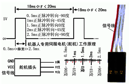 伺服馬達的電源引線 電源引線有三條,如圖中所示。伺服馬達三條線中紅色的線是控制線,接到控制芯片上。中間的 是SERVO工作電源線,一般工作電源是5V。第三條是地線。