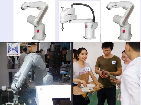 (圖為我司三菱機器人產品以及工作人員向顧客熱情解說我司三菱原裝機器人產品)