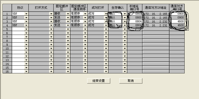 上圖是選擇TCP通訊協議時的情況,圖中鉛筆圈定的兩個地方要注意,第一處一定要選“有順序”否則會引起通訊失敗,第二處一定要選 “確認”,這樣才能與上一圖中的設置相對應,否則會導致通訊恢復需要很長時間。