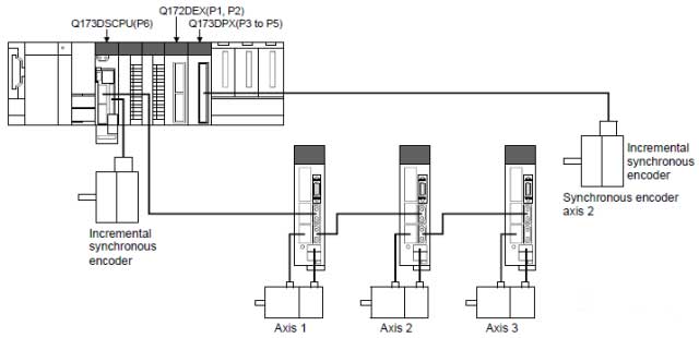 當通過同步編碼器類型時,可以選擇通過Motion內置接口的編碼器、Q172DEX同步編碼器輸入模塊或Q173DPX手脈輸入模塊進行輸入,控制圖如下: